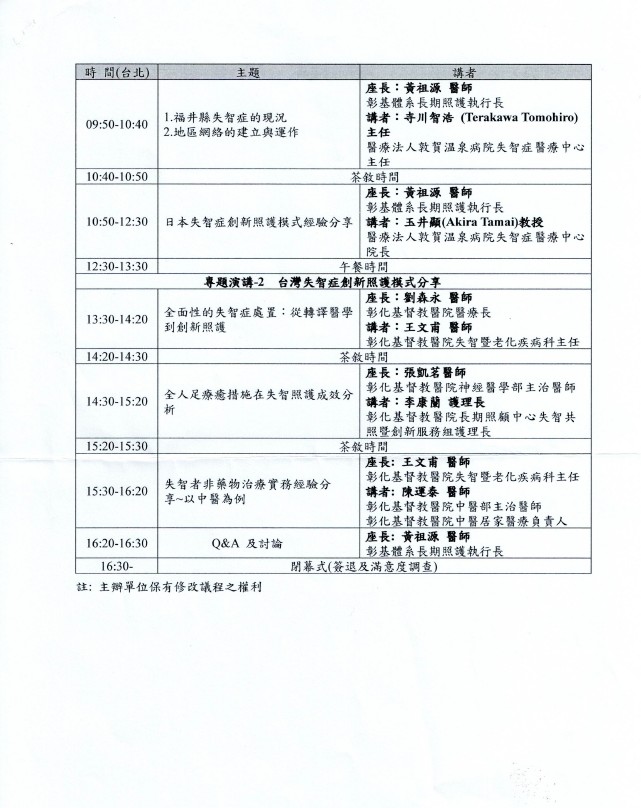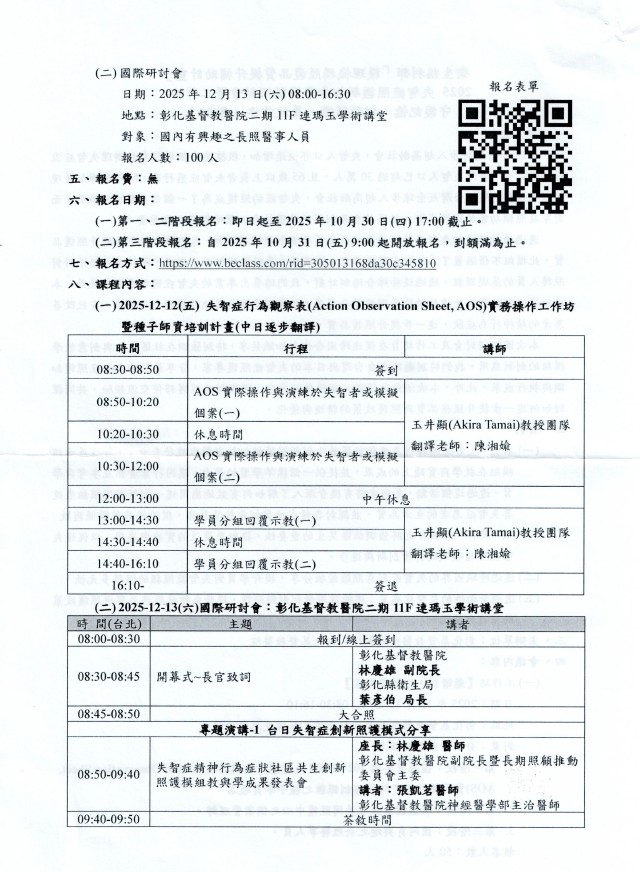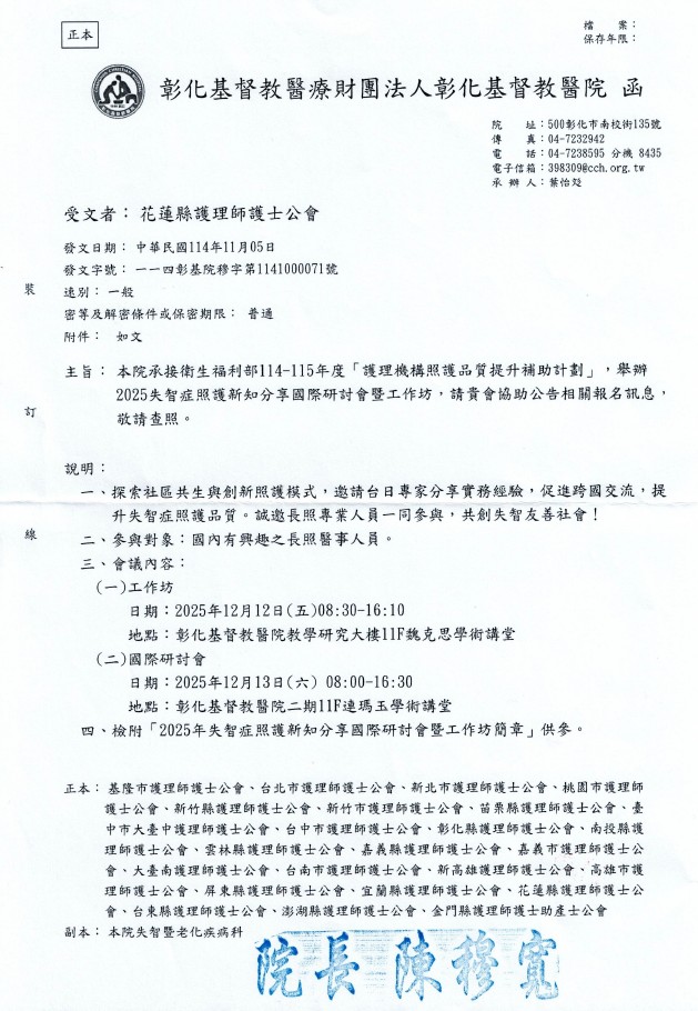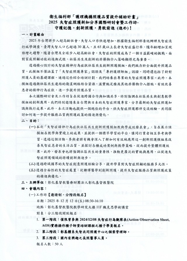 彰化基督教醫院承接衛生福利部114-115年度「護理機構照護品質提升補助計劃」,舉辦2025失智症照護新知分享國際研討會暨工作坊。