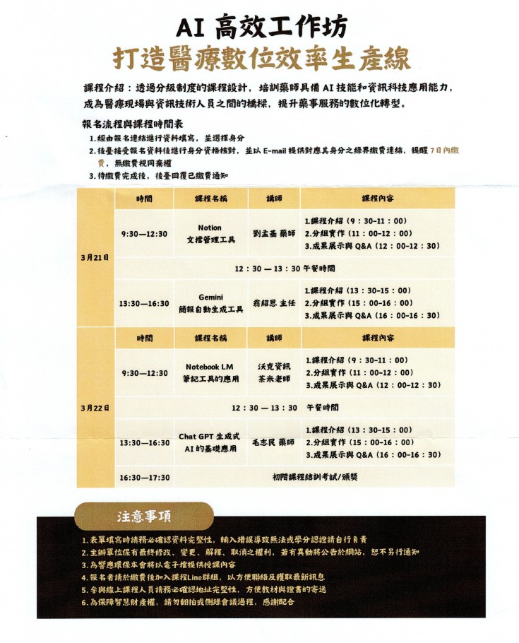 為協助醫療人員提升數位與 AI 工具的實務應用能力,特辦理「AI 高效工作坊」,透過實作導向課程,協助學員將 AI 工具實際導入日常醫療與行政工作流程中。